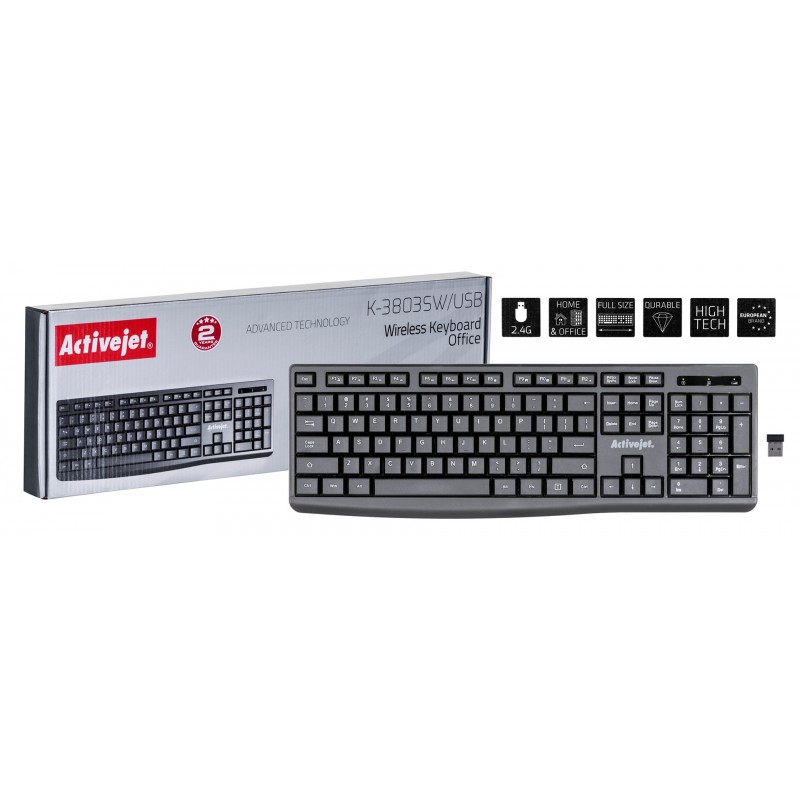 Bežična, pristupačna uredska tipkovnica tvrtke ActiveJet. Tipkovnica je Plug&Play, što znači da je samo uključite u računalo i spremna je za korištenje. Tipkovnica ima slovenski raspored tipki.