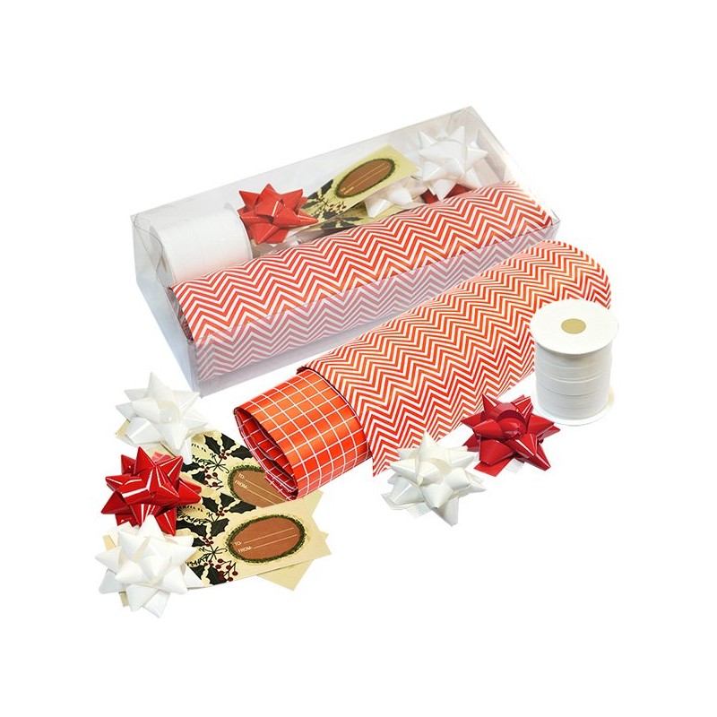 Novoletni set sadrži:- 2 x mašna- 1 traka (10 m)- 2x papir (70 x 100 cm)- 3 x čestitka